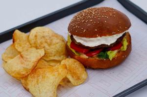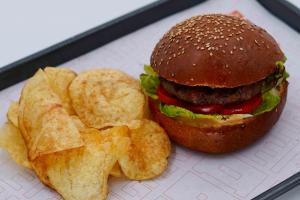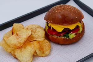 نان بریوش+برگر 150 گرمی+سس رمولاد+کرم چیز+کاهو+گوجه فرنگی+چیپس دست ساز