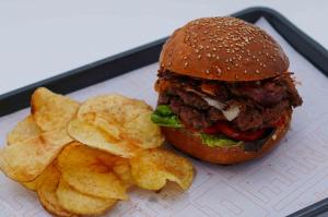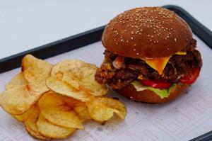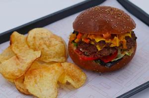 نان بریوش+2عدد برگر اسمش+پنیر موزارلا+پولدبیف+بیکن گوساله+سس پاپریکا+سس رمولاد+کاهو+گوجه فرنگی+چیپس دست ساز