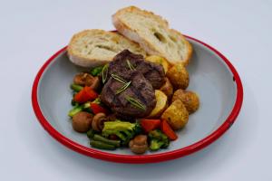 فیله گوساله+سیب زمینی+سبزیجات سوته شده+سس قارچ