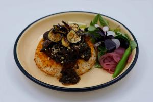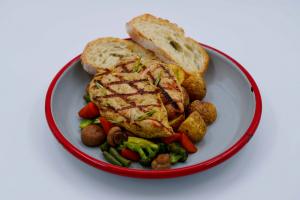 سینه مرغ+سیب زمینی+سبزیجات سوته شده+سس قارچ
