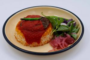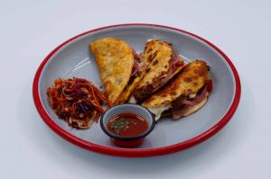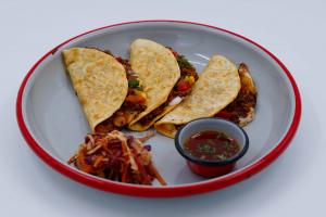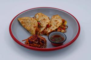 نان ترتیا+گوشت چرخ شده مزه دار (چیلی کان کارنه)+سالسای گوجه+سالسای انبه+پنیر موزارلا+سس رمولاد+سالاد کلم