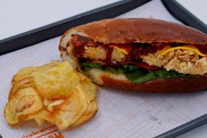 نان بریوش+سینه مرغ سوخاری+پنیر چدار+سس بوفالو+کاهو+گوجه فرنگی+چیپس دست ساز