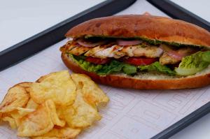 نان بریوش+سینه مرغ گریل+سس پستو+کاهو+گوجه فرنگی+چیپس دست ساز