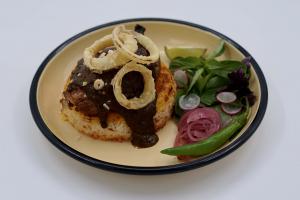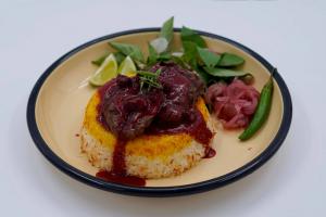 نان ترتیا+مغز ران گوساله سس پز+سالسای گوجه+پیکل پیاز+پنیر موزارلا+سس رمولاد+سالاد کلم