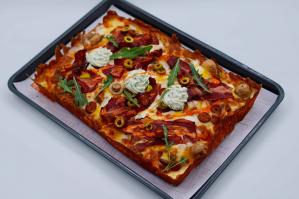 خمیر پیتزا+سس بیانکا+بیکن گوساله+چوریزو+قارچ دکمه ای بلانچ+زیتون+پنیر پیتزا+سس پاپریکا+کرم چیز+روکولا
