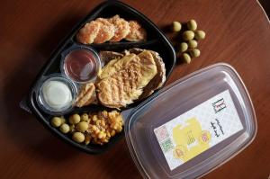 مرغ.پوره سیب زمینی وهویج.ذرت.زیتون.گوجه.تخم مرغ ۱عدد.سس رژیمی.۲عدد نان پروتیینی. (درنبود ظرف مورد نظر در ظرف گیاهی سرو میشود)