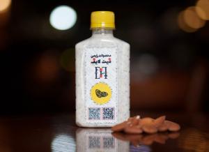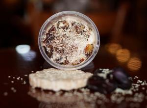 جوی دوسر.بادام.موز.کره بادام زمینی.شیر کم چرب.پودر نارگیل.خرما.(درنبود ظرف داخل تصویر داخل ظرف شیک بیرون بر سرو میشود)