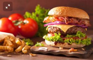 دوتا همبرگر ۶۰٪، با قارچ پنیرکاهو،گوجه،خیارشور،نان باگت،به همراه یک عدد سس