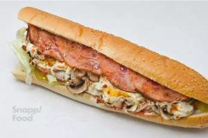 ژامبون گوشت و قارچ کاهو،گوجه، خیارشور،نان باگت،به همراه یک عدد سس