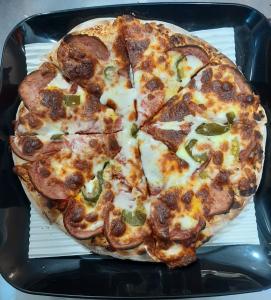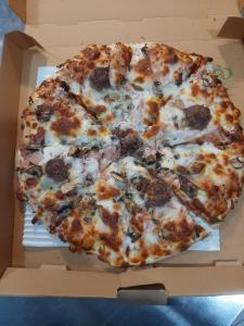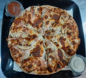خمیر پیتزا دست ساز +ژامبون مرغ و گوشت + چرخ کرده مزه دار شده+کوکتل دودی + پنیر پیتزا +قارچ