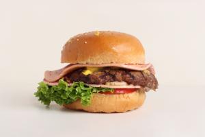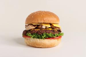 برگر ۱۸۰ گرمی گوشت گوساله+۲عدد ژامبون ۸۰درصد گوشت مرغوب+ قارچ + پنیر پیتزا +کاهو فرانسوی+ گوجه+خیارشور+نان کنجدی سحر+ یک عددسس کاسه ای دست ساز