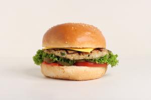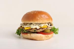 چیکی برگر۱۷۰ گرمی(ترکیب چرخ کرده گوشت مرغ وگوسفندی) + ژامبون۸۰ درصد گوشت مرغوب + قارچ بلانچ+ پنیر پیتزا +کاهو فرانسوی+گوجه+خیارشور+نان کنجدی سحر+ یک عددسس کاسه ای دست ساز
