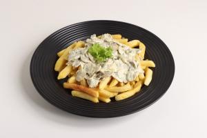 پنه+سس آلفردو+گوشت ریششده گوساله+پنیرپیتزا+قارچ+ پنیرپارمسان+ گوجه گیلاسی