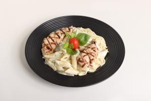 پاستا پنه + 2عددفیله گریل مرینت شده(۱۵۰ گرم)+ قارچ و پنیر پیتزا+ سس آلفردو+پنیر پارمیسان+گوجه گیلاسی