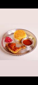 یک عدد ران مرغ350گرمی سرخ شده،،،300گرم کته ایرانی،،، دورچین:کلم ترشی و لیمو و فلفل کبابی،،،