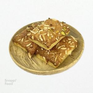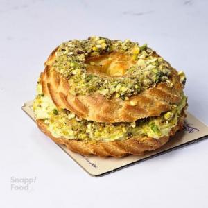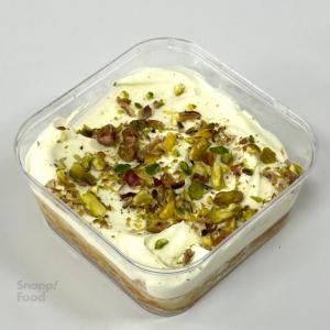 یک اسلایس کیک یک نفره، دسر خوشمزه و بین المللی که ترکیب چند نوع کرم همراه با نان خامه ای، پسته، کره پسته و پرالین پسته است که ترکیب دل نشینی را فراهم کرده است