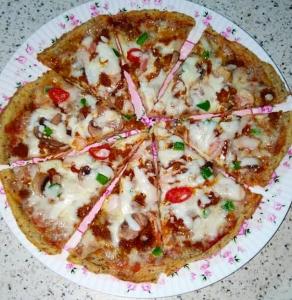 ژامبون مرغ و گوشت (جای خمیر پیتزا)، سینه مرغ مزه داره شده، قارچ، پنیر پیتزا، فلفل دلمه و گوجه