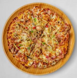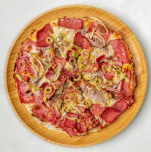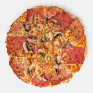 سس گوجه فرنگی، بیکن گوشت، ژامبون فیله، قارچ، پنیر، زیتون، سس مخصوص، روغن زیتون سیر