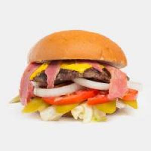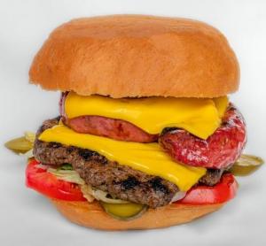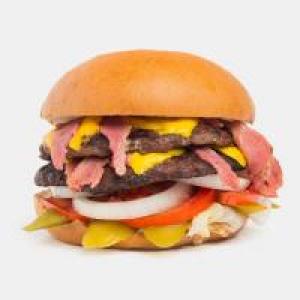 دولایه گوشت برگر، دولایه بیکن ایرلندی، پنیر گودا، کاهو، گوجه فرنگی، خیارشور، پیاز حلقه ای