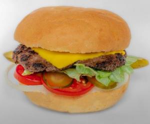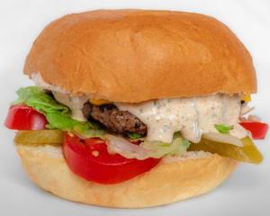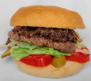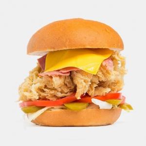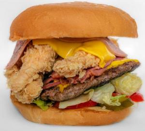 فیله سوخاری مرغ، ژامبون گوشت، گوشت برگر، پنیرگودا، پنیر چدار، کاهو، گوجه فرنگی، خیارشور