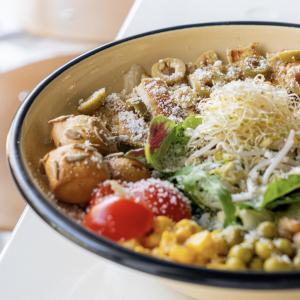کاهو پیچ _ فیله مرغ گریل _ ذرت _ نخود سبز _ گوجه گیلاسی _ جوانه _ نان سالادی