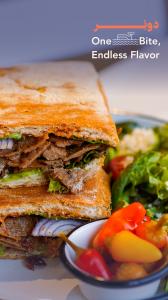 150 گرم کباب ترکی دونر طعم دار شده _ کاهو فرانسه _ گوجه _ پیاز بنفش _ سس مخصوص _ساید سالاد