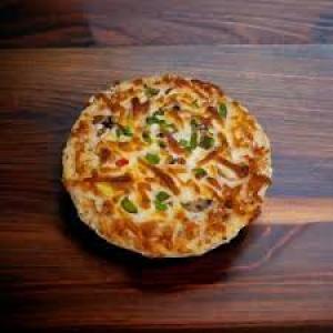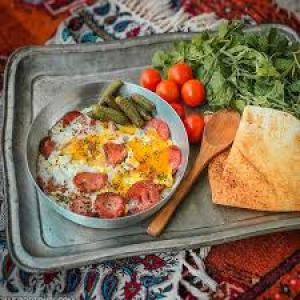دو عدد تخم مرغ،رب،قارچ،فلفل دلمه، پنیر پیتزا،۳تکه نان بربری یا سنگک،دورچین