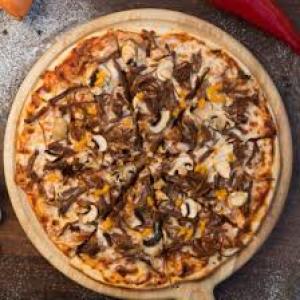 خمیر دست ساز امریکایی , سس مخصوص , 160 گرم گوشت رست , قارچ , پنیر پیتزا