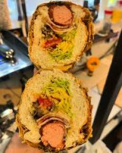 دوعدد نان باگت هات داگ 75% برگر 90% گوشتیران 4 ورق ژامبون مرغ و گوشت پنیر پیتزا یک عدد پنیر گودا گوجه خیارشور کاهو یک عدد سس