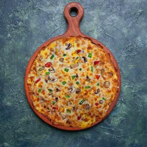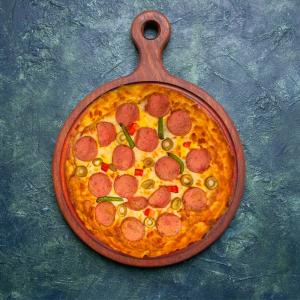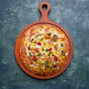 خمیر پیتزا آمریکایی،ژامبون گوشت و مرغ،کالباس پپرونی تند،هات داگ اسلایس شده،دیپ چدار،قارچ،پنیر پیتزا،و..
