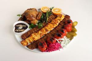 160 گرم جوجه،140 گرم چنجه،140 گرم کوبیده،450 گرم برنج ایرانی ،ته چین،خیار شور،گوجه کبابی، فلفل،لیمو،ترشی