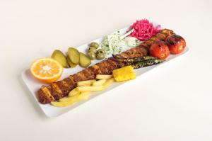 150گرم گوشت گوسفندی و گوساله،300 گرم سینه مرغ ،گوجه و فلفل کبابی ،ترشی، خیار شور ،ریحان،450 گرم برنج ایرانی،ته چین