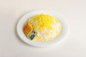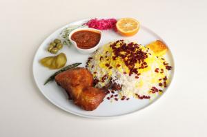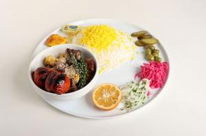 250 گرم گوشت مغز ران گوساله،450 گرم برنج ایرانی ،ته چین،خیار شور،گوجه کبابی، فلفل،لیمو،ترشی