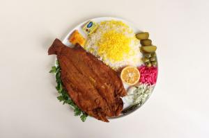 ماهی کامل 600 گرمی،450 گرم برنج ایرانی،ته چین،خیار شور،گوجه کبابی، فلفل،لیمو،ترشی