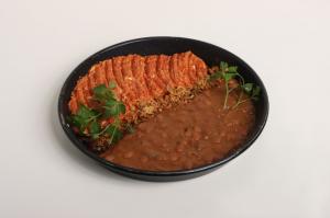 160 گرم مغز ران گوساله،350 گرم برنج ایرانی،ته چین،خیار شور،گوجه کبابی، فلفل،لیمو،ترشی