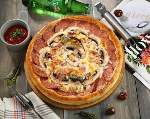سس مارینارا، پنیر موتزارلا، پنیر پارمزان، استیک ورقه ای، مرغ سماقی، پیاز حلقه ای، گوجه گیلاسی، زیتون، فلفل دلمه