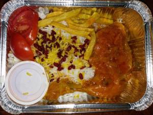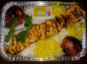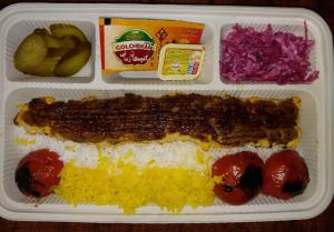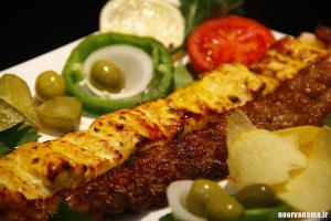 دو سیخ کوبیده 100 گرمی و یک سیخ جوجه کباب 180 گرمی به همراه ۴۰۰ گرم برنج درجه یک ایرانی اعلا به همراه دورچین حاوی ترشی کلم قرمز و فلفل تند وخیارشور و لیمو
