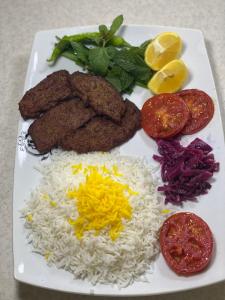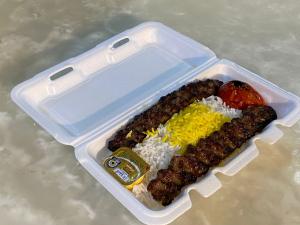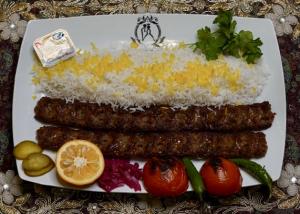 2 سيخ 80 گرمي مخلوط گوشت گوساله و گوسفندي + برنج ايراني به همراه گوجه