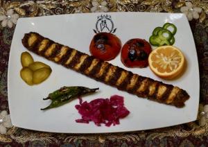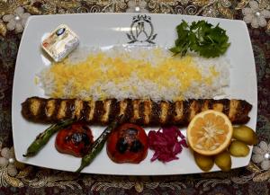 ١ سيخ ٢٦٠ گرمي مخلوط گوشت گوساله و گوسفندي با تكه مرغ نگيني + برنج ايراني به همراه دورچين