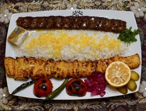 ١ سيخ جوجه كباب 170 گرمي + ١ سيخ كباب كوبيده ١٢٠ گرمي + برنج ايراني به همراه دورچين