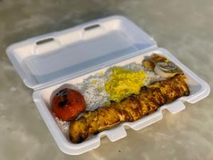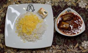 300 گرم خورشت + ١٢٠ گرم گوشت مغز ران گوساله +برنج ايراني به همراه بادمجان سرخ شده