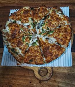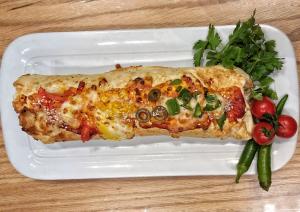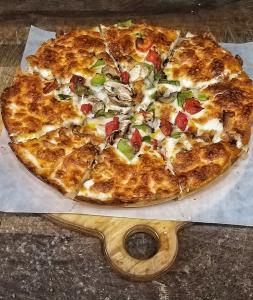 سینه مرغ، قارچ، فلفل دلمه، گوجه فرنگی، پیاز، پنیر، سس مخصوص