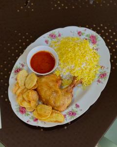 یک تیکه ران مرغ 400 گرمی سرخ شده به همراه سیب زمینی و سس مرغ و پلو صد در صد ایرانی
