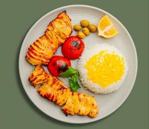 (کالری 608) 250 گرم سینه مرغ گریل شده + سبزیجات میکس مزه دار شده + 250 گرم پوره یا سیب زمینی + نان جو