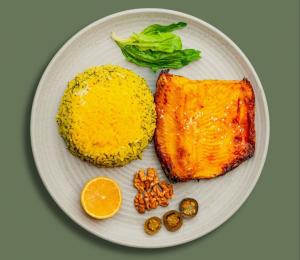 (415 گرم) (کالری 468) 200 گرم فیله ماهی سالمون (قزل آلا) گریل شده + سبزیجات مزه دار شده + 250 گرم پوره یا سیب زمینی + نان جو