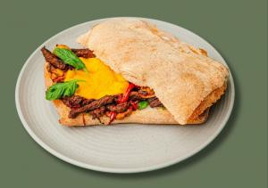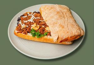 (494) مغزران پخته و ریش شده گوساله + سس گوجه + پنیر پیتزا کم چرب + گوجه خشک + پیکل خیار + قارچ + نان (لطفا در قسمت توضیحات نوع نان انتخابی خود را بنویسید: نان جو یا نان چاپاتا)