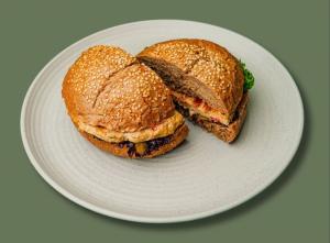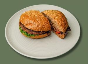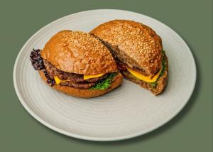 2عدد برگر گوشت گوساله + کاهو فرانسه + گوجه +خیار شور+ پنیر گودا رژیمی +نان برگر جو