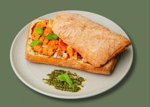 (کالری 420) سینه مرغ مزه دار شده+ سس پستو + پنیر پیتزا کم چرب + ریحان + گوجه خشک + نان (لطفا در قسمت توضیحات نوع نان انتخابی خود را بنویسید: نان جو یا نان چاپاتا)