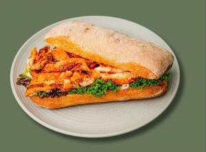 سینه مرغ مزه دار شده +قارچ+هالوپینو+فلفل دلمه+سس مخصوص گرینا(تند)+نان چاپاتا یا جو