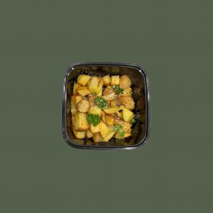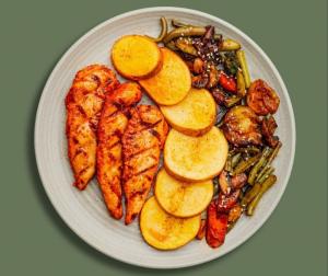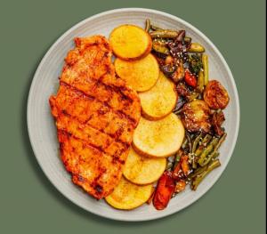 (کالری 608) سینه مرغ گریل شده + سبزیجات میکس مزه دار شده + 250 گرم پوره یا سیب زمینی + نان جو